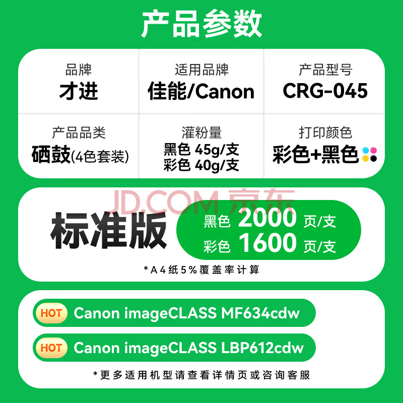 商品相册:才进CRG045硒鼓彩色套装佳能MF635Cx MF633Cdw MF631Cn打印机粉盒LBP612 LBP613 LBP611墨盒mf632 634Cdw碳粉第