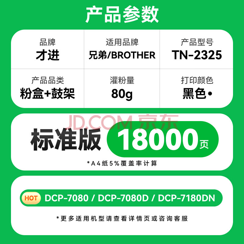 商品相册:才进适用兄弟7080d粉盒mfc7380硒鼓tn2325碳粉7180dn墨粉盒hl2260d 7480d 7880DN dr2350 dcp7080d打印机墨盒第