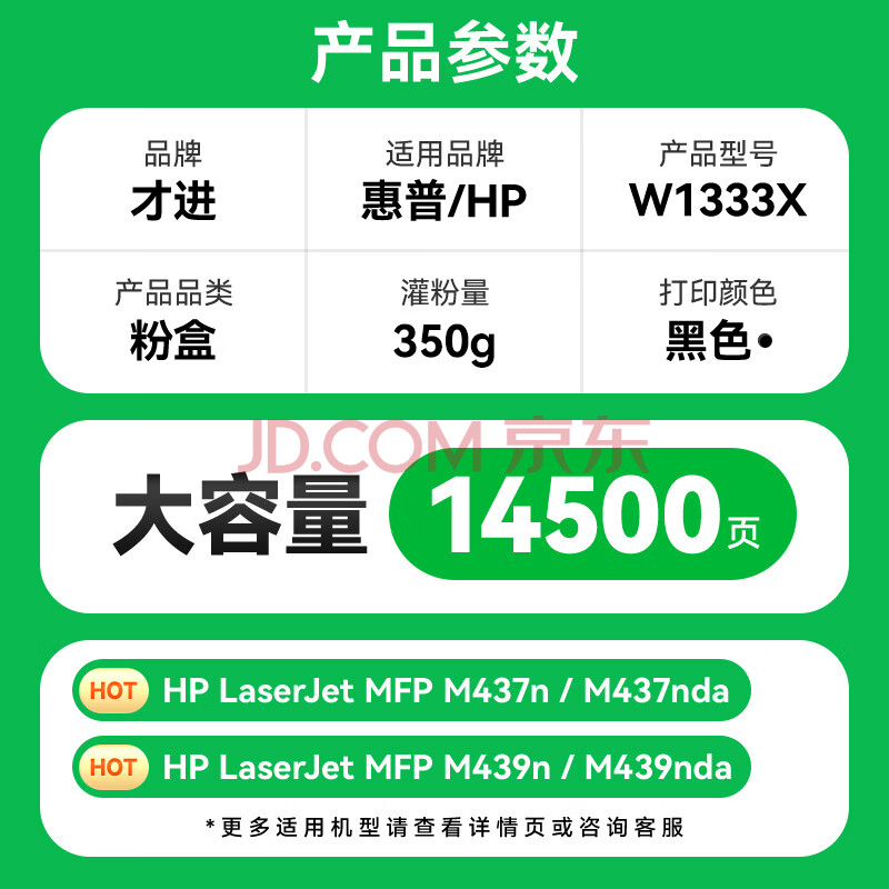 商品相册:才进适用惠普W1333X粉盒LaserJet MFP m437n m437dn m437nda复印机硒鼓m439n m439nda m439dn碳粉W1333A 333X第