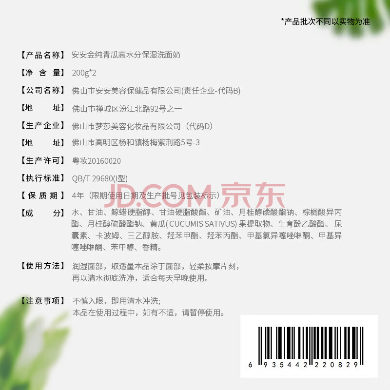 商品相册:安安金纯 A'Gensn青瓜高水分保湿洗面奶清爽补水保湿无泡沫200g*2第
