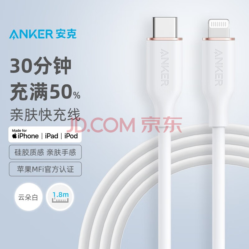商品相册:ANKER安克 充电线【MFi认证】苹果iphone12/13/14手机充电器亲肤type-c转lightning快充数据线 1.8m白第