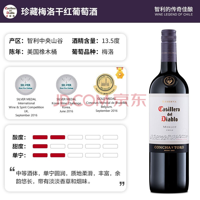 商品相册:红魔鬼(Casillero del Diablo)珍藏梅洛干红葡萄酒 750ml单瓶 智利原瓶进口红酒第