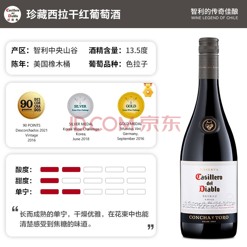 商品相册:红魔鬼(Casillero del Diablo)珍藏西拉干红葡萄酒 750ml单瓶装 果酱芬香 智利原瓶进口红酒第