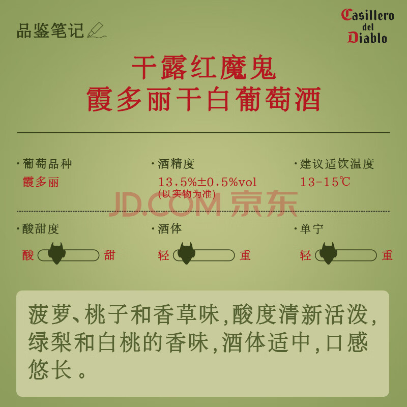 商品相册:红魔鬼(Casillero del Diablo)珍藏级霞多丽干白葡萄酒750ml单瓶装 智利原瓶进口红酒第