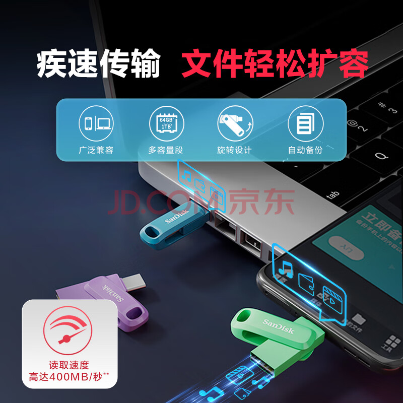 商品相册:闪迪(SanDisk)512GB Type-C USB3.2 手机U盘DDC3黑色 读速高达400MB/s 自动备份 手机电脑两用 双接口大容量优盘第