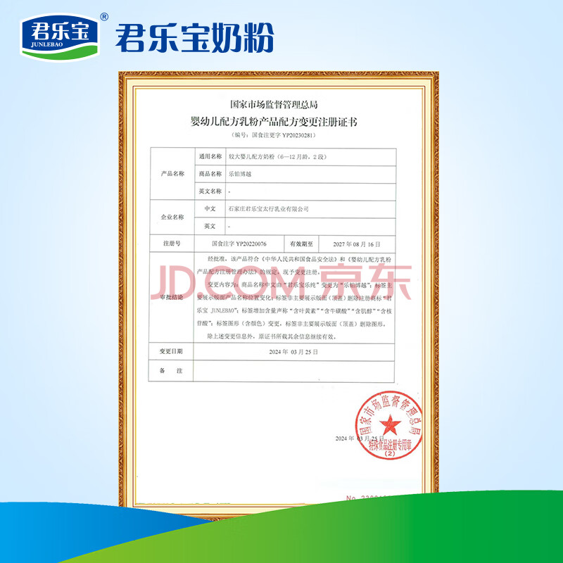 商品相册:君乐宝乐铂博越 2段较大婴儿配方奶粉(6-12个月龄)800克第
