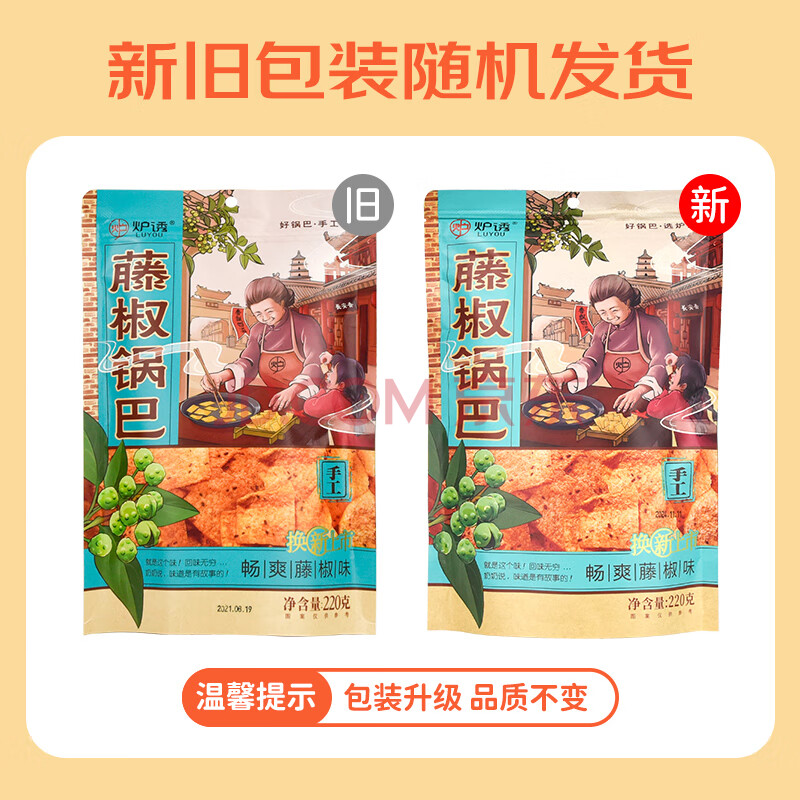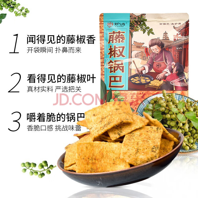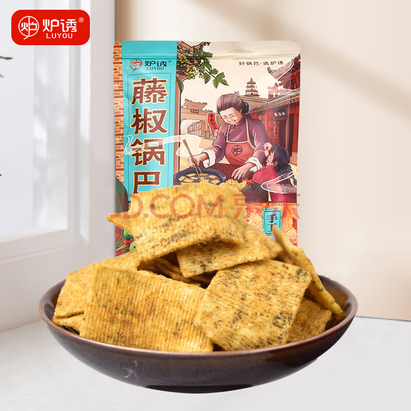 商品相册:炉诱老式锅巴藤椒味220g手工大米香脆锅巴网红休闲膨化零食办公室小吃第
