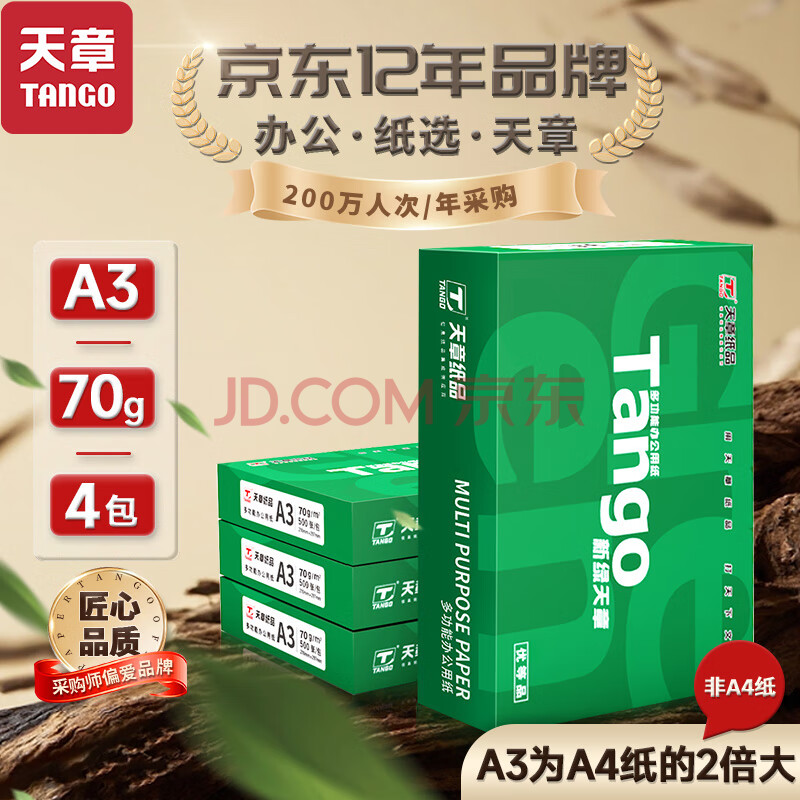 商品相册:天章 (TANGO)新绿天章A3打印纸70g 500张*4包 (297*420mm) 工程绘图纸 手抄报画纸复印纸 整箱2000张【品质款】第