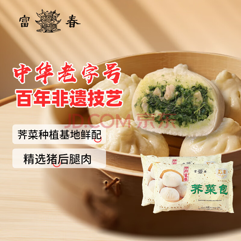 商品相册:富春荠菜包300g*2 12只装早餐包子速食速冻蒸包半成品 扬州特产包子第