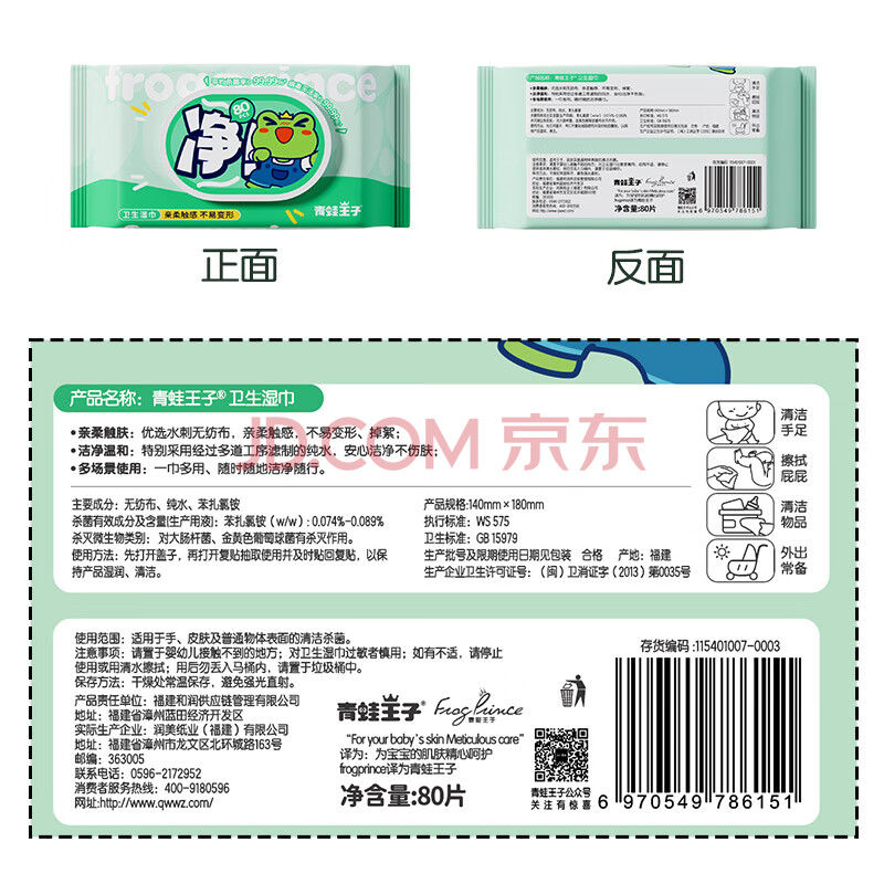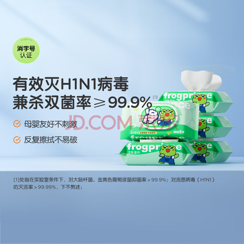 商品相册:青蛙王子卫生湿巾 无酒精99.9%杀菌宝宝湿巾清洁卫生湿纸巾大尺寸80抽*3包第