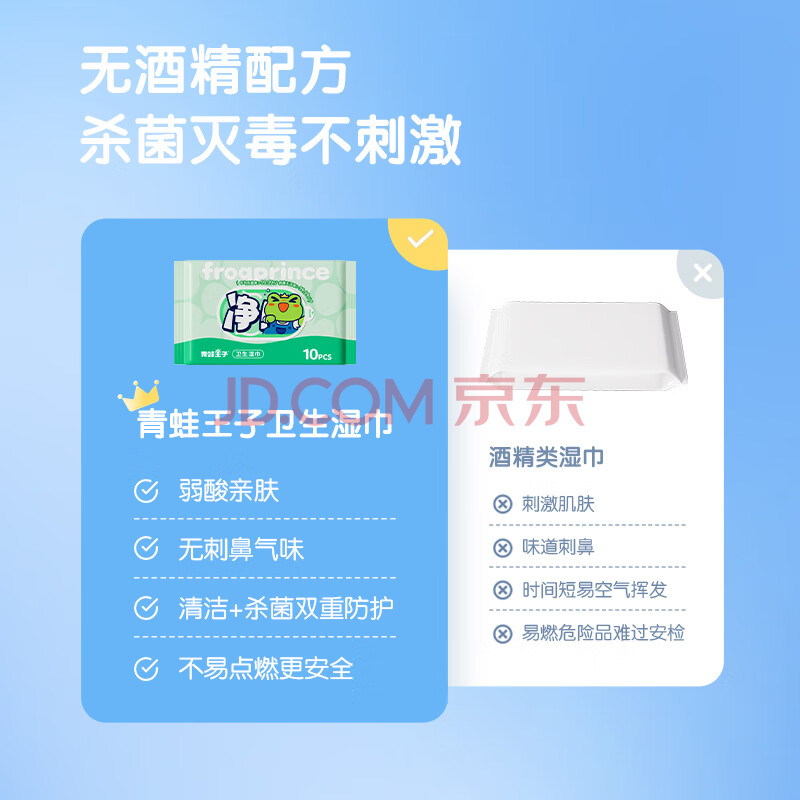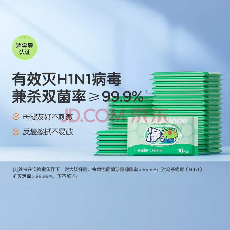 商品相册:青蛙王子卫生湿巾99.9%杀菌无酒精宝宝清洁湿巾除菌便携小包 10抽*20包第
