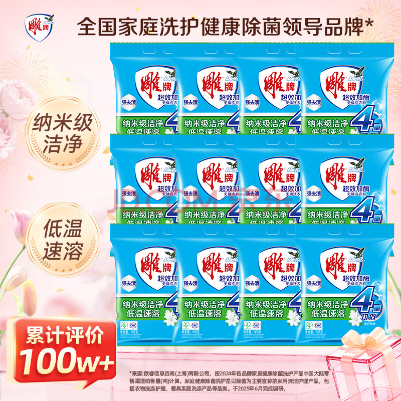 商品相册:雕牌 超效加酶洗衣粉 茉莉清香 1.016斤*12 无磷 低温速溶 强效去渍第
