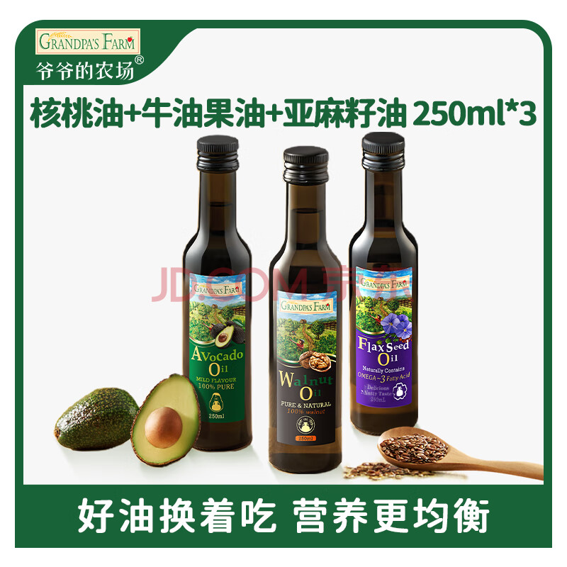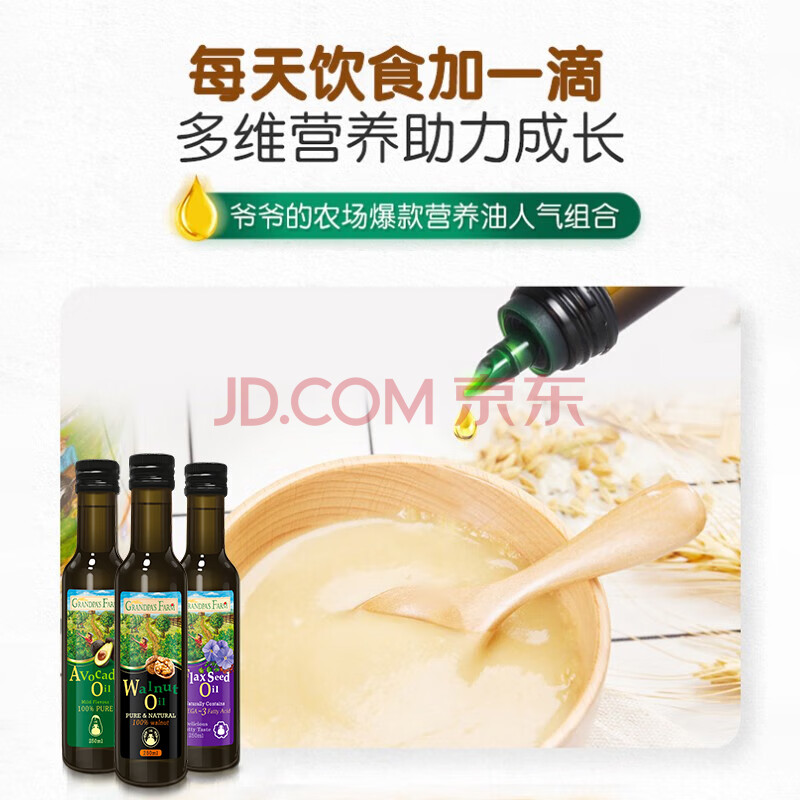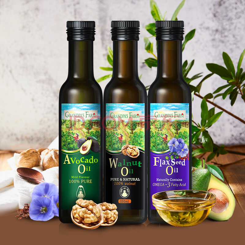 商品相册:爷爷的农场核桃油牛油果油亚麻籽油250ml*3瓶 热炒凉拌 赠婴儿宝宝辅食食谱第1张/共7