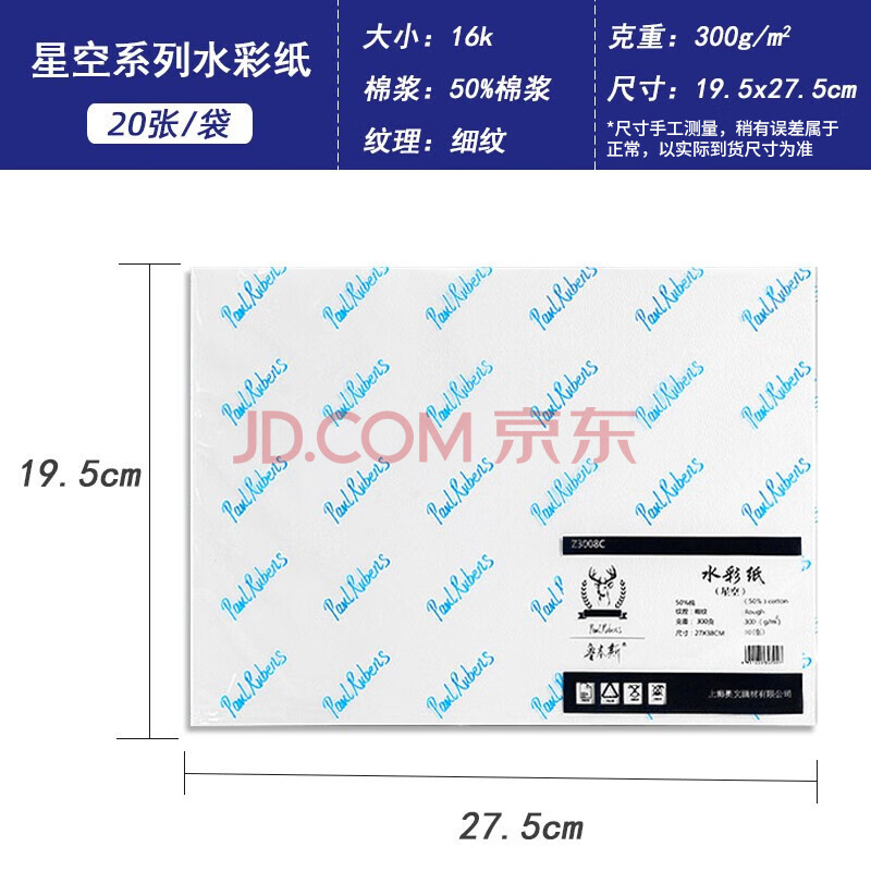 商品相册:鲁本斯(PaulRubens)星空水彩纸加厚16K细纹300g棉浆纸素描纸学生初学美术绘画纸20张/包0111081第