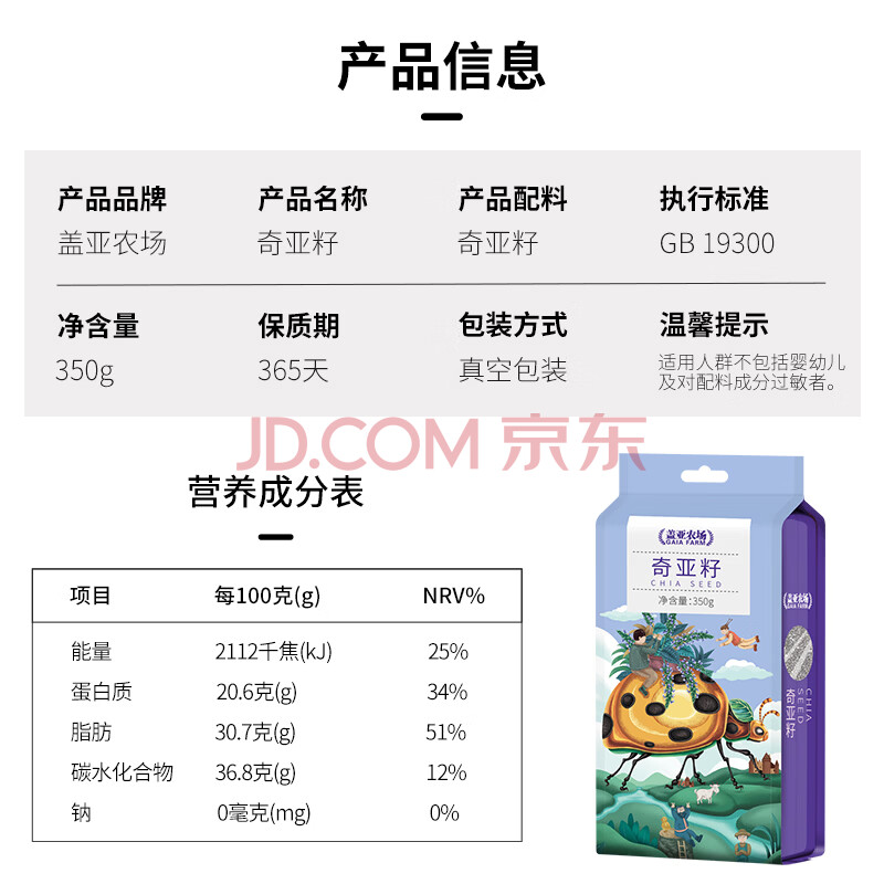 商品相册:盖亚农场奇亚籽350g 免洗齐亚籽蜜即食饱腹酸奶伴侣代餐轻食真空第