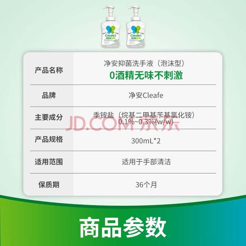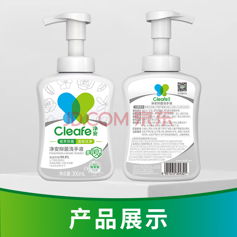 商品相册:净安泡沫型洗手液300ml*2瓶(栀子花香)儿童玻尿酸保湿抑菌率99.9%第