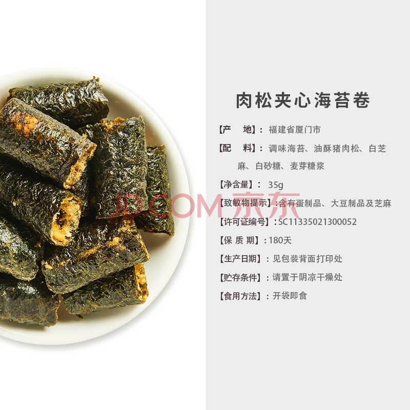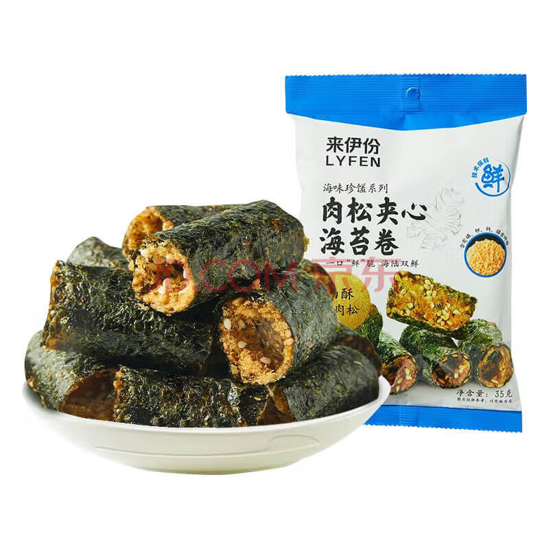 商品相册:来伊份 肉松夹心海苔卷35g 办公室休闲零食夹心脆肉松卷拌饭即食小吃第