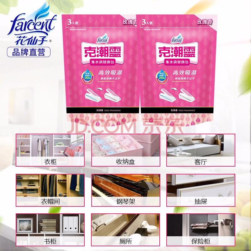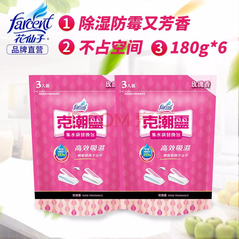 商品相册:花仙子(Farcent)集水袋补充包玫瑰香180g*6袋贵重物品钢琴首饰字画衣柜除湿干燥剂第1张/共3