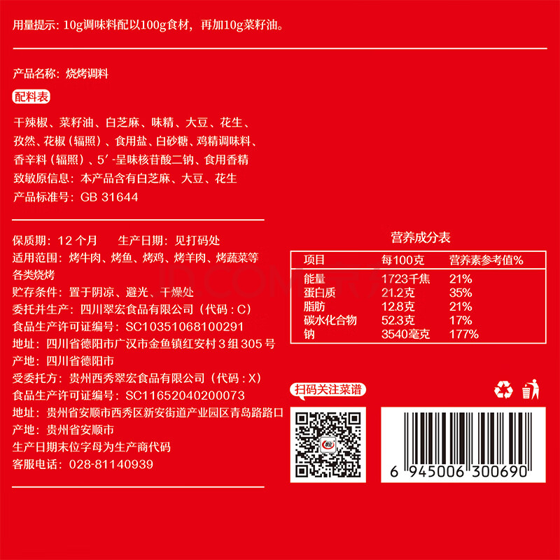 商品相册:翠宏烧烤调料450g 烤肉腌料烧烤撒料辣椒面 串串蘸碟第