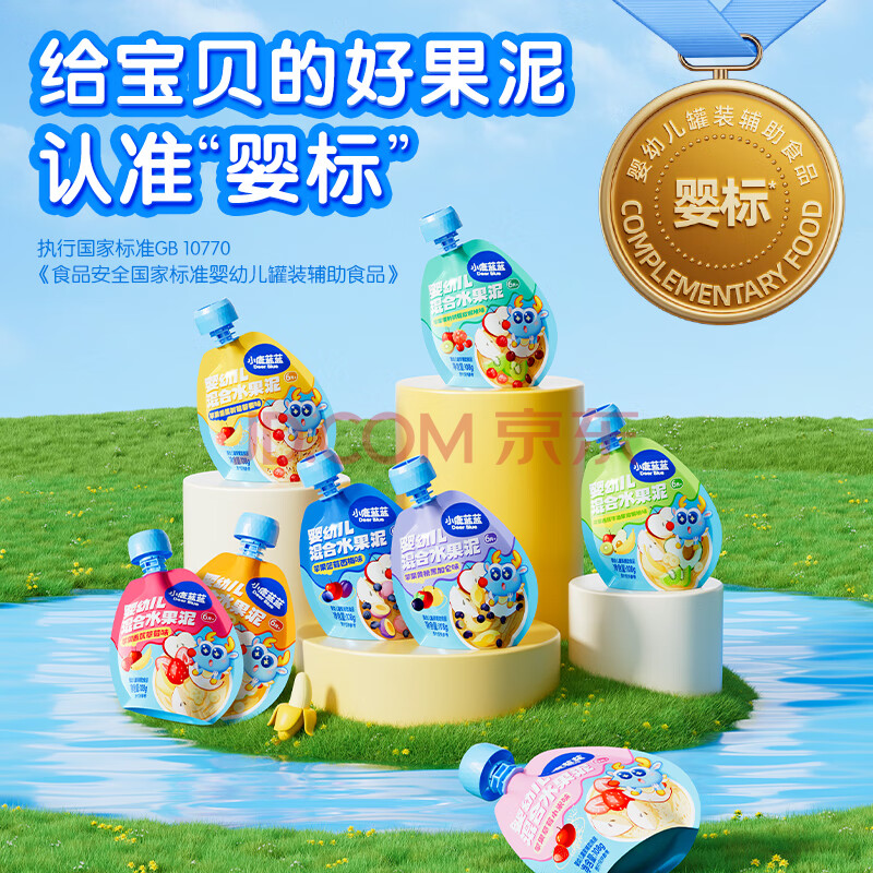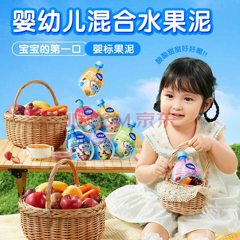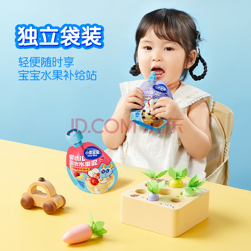 商品相册:小鹿蓝蓝_婴幼儿趣味果泥苹果黄桃黑加仑 宝宝辅食营养水果泥 108g第