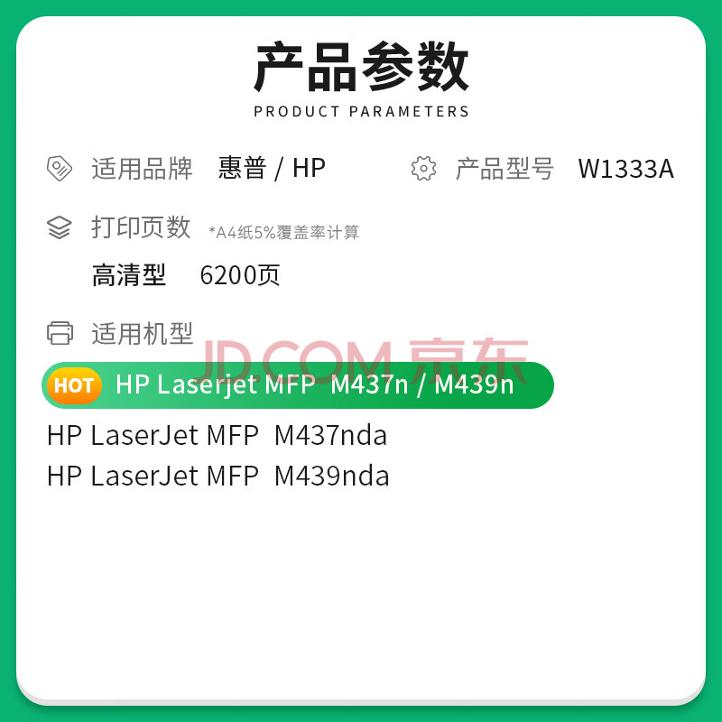 商品相册:才进适用惠普W1333A碳粉LaserJet MFP m437n m437dn m437nda复印机墨粉m439n m439nda m439dn粉盒W1333X 333A第