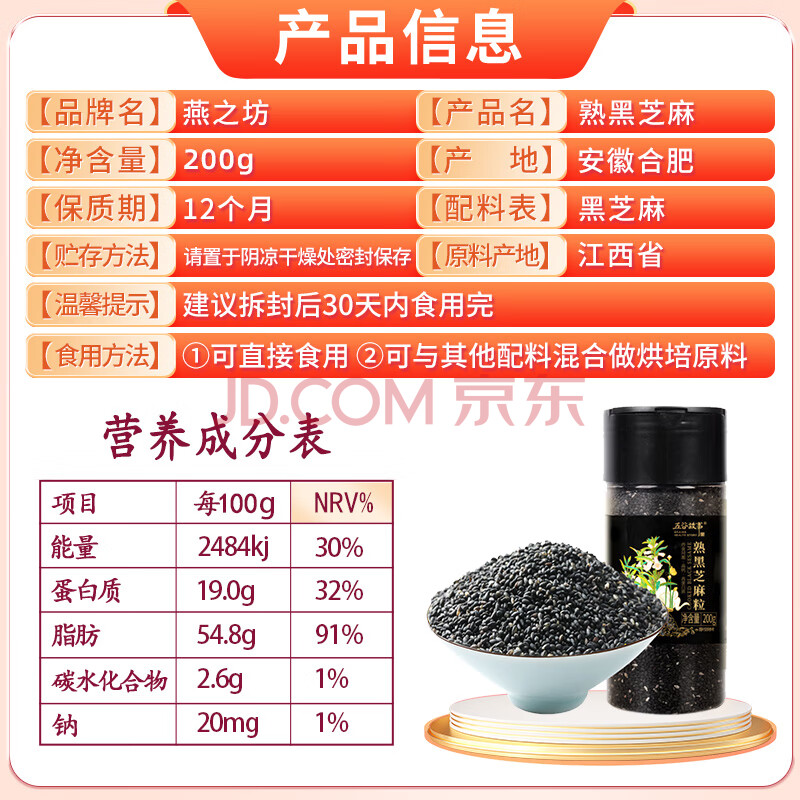 商品相册:燕之坊 熟黑芝麻200g(低温烘焙 免洗干吃熟芝麻粒) 第