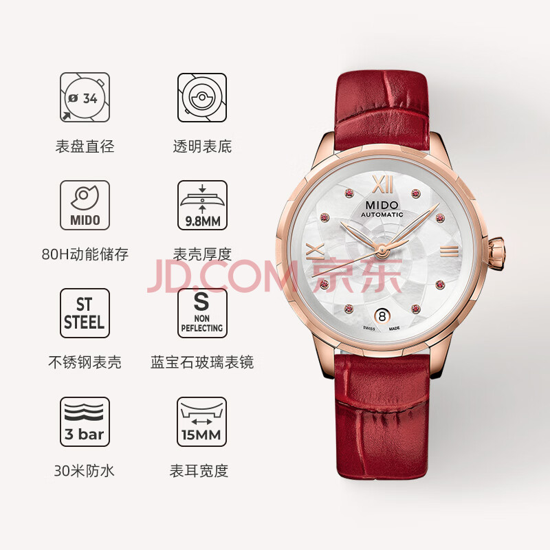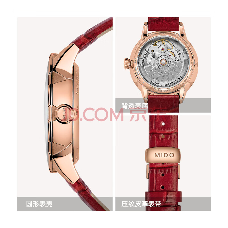 商品相册:美度(MIDO)瑞士手表 花淅系列 复古红 长动能 时尚优雅 机械皮带女表第