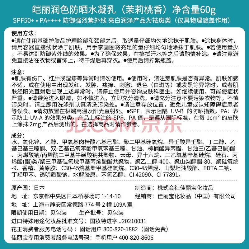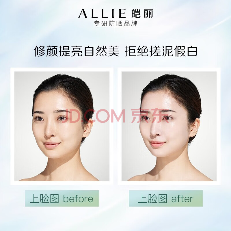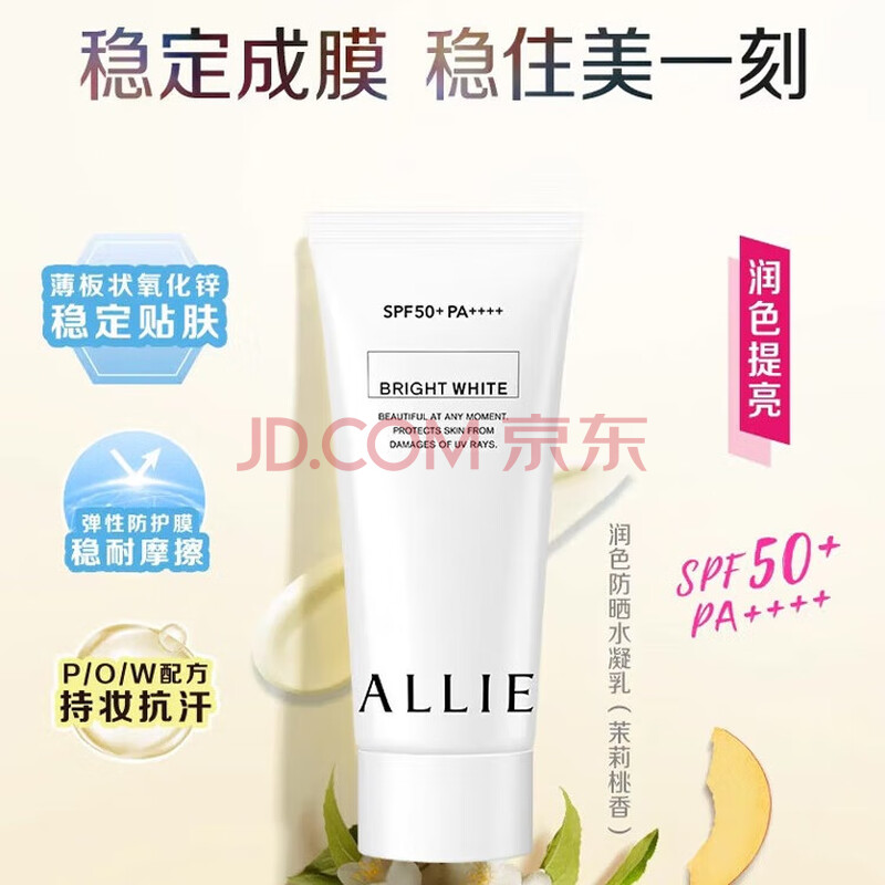 商品相册:皑丽(ALLIE)嘉娜宝防晒霜户外通勤保湿水润提亮隔离妆前乳SPF50+茉莉桃香60g第