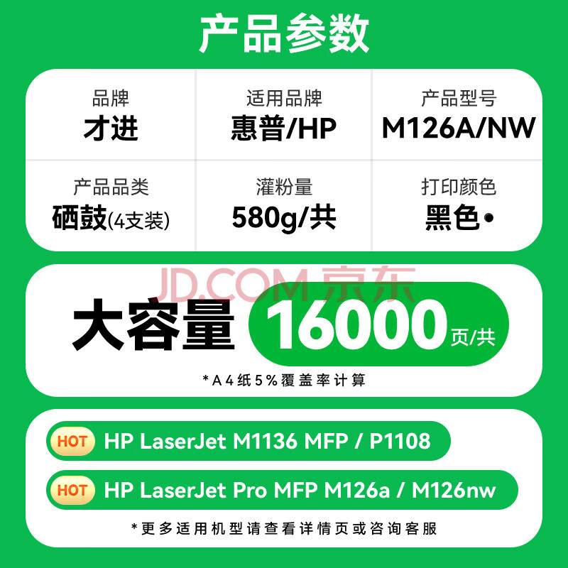 商品相册:才进适用惠普m126a硒鼓4支装m126nw打印机墨盒hp126a易加粉复印一体机晒鼓cc388a 88a 388a碳粉墨粉laserjet第