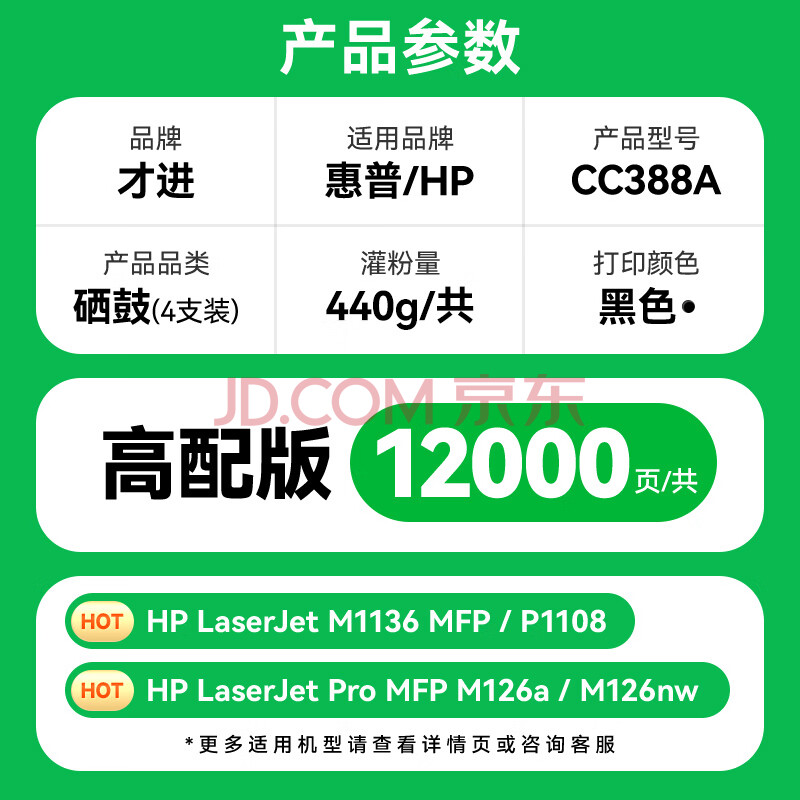 商品相册:才进适用惠普m1136硒鼓M126a/nw p1108 P1106 cc388a M128fn/fp/fw p1007 p1008打印机388a m1213nf墨粉盒88a第