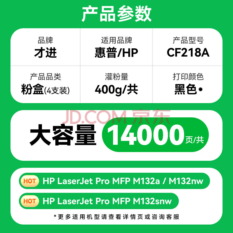 商品相册:才进适用惠普M132a硒鼓LaserJet Pro MFP M132fw/fn/fp墨盒M104a/w打印机HP18a碳粉CF218a粉盒M132nw M132snw第1张/共7