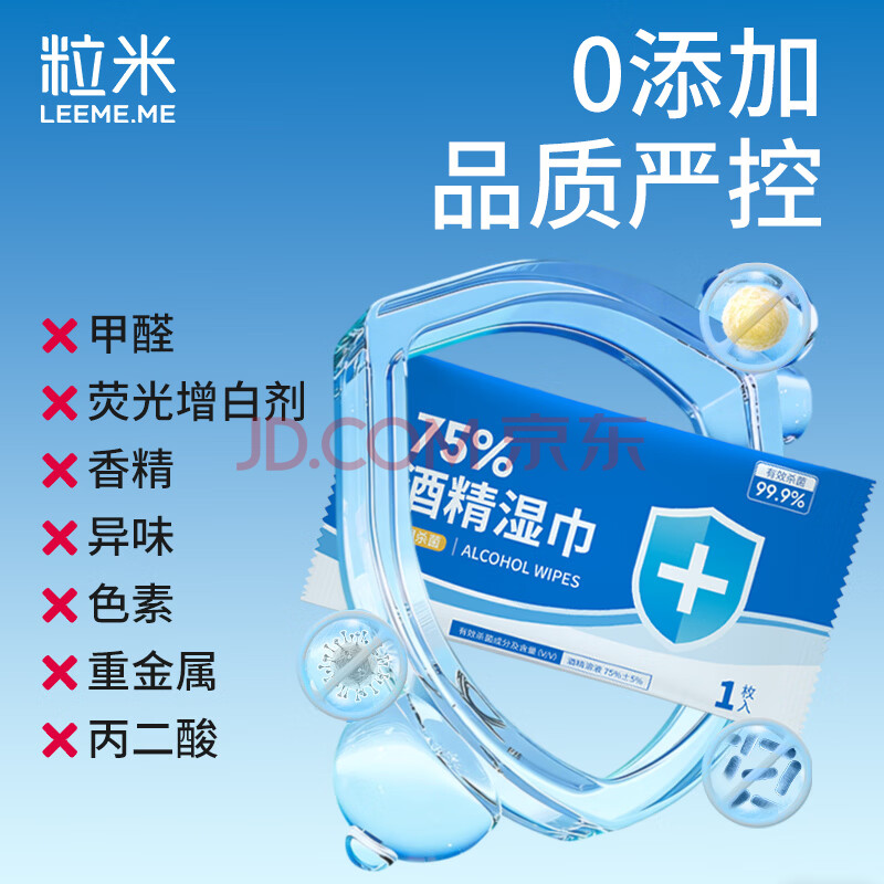商品相册:粒米75%酒精湿巾30片独立装消毒杀菌湿纸巾儿童上学甲流感酒精棉片第