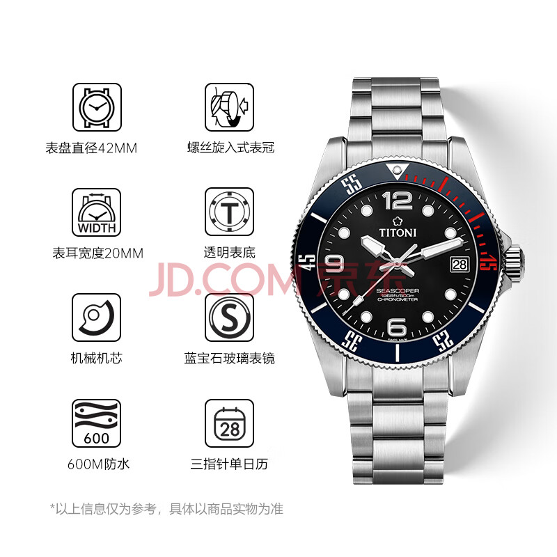 商品相册:梅花(Titoni)瑞士手表男士机械表 海洋探索系列600M自动潜水腕表 天文台认证第