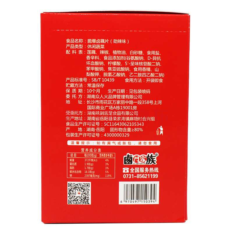 商品相册:卤门家族藕片黑鸭味26g*20袋/盒 办公室休闲零食香辣藕片卤藕零食特产第