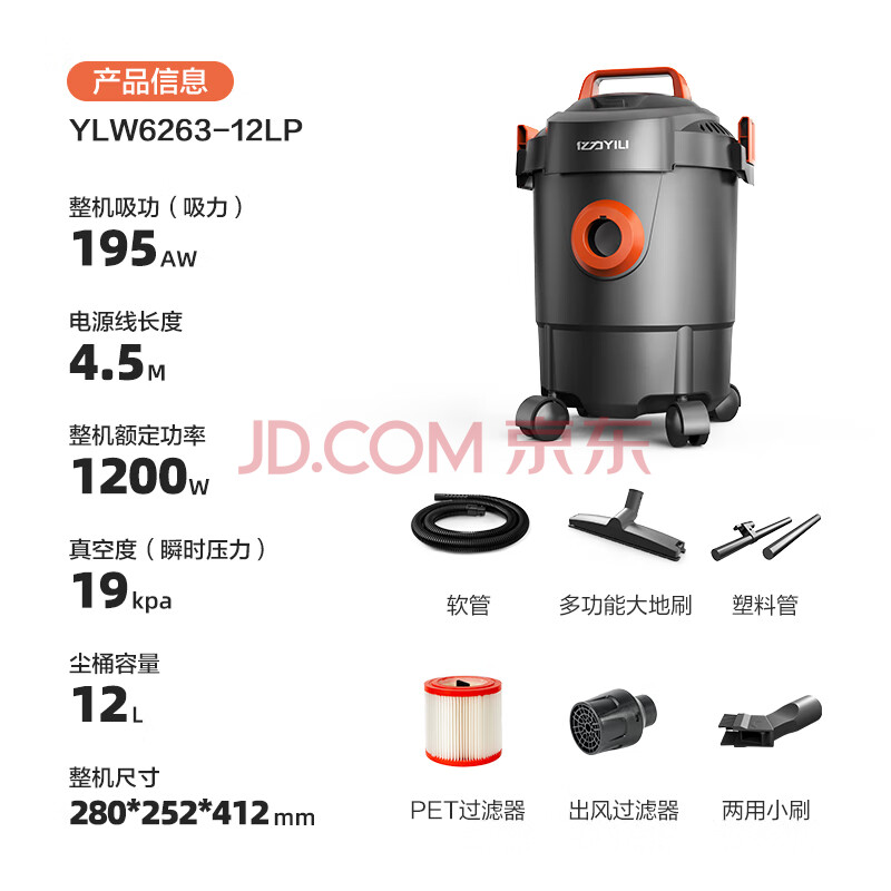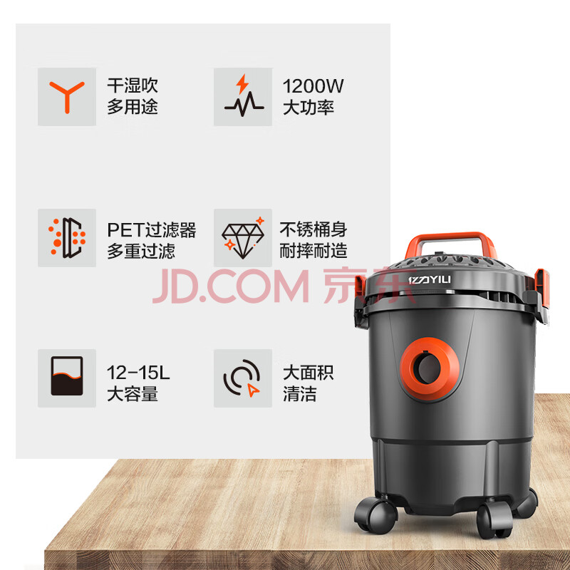 商品相册:亿力吸尘器车家干湿两用超强大吸力 吹吸一体机除尘工业开荒保洁地毯家庭清洁手持有线桶式6263-12L 第