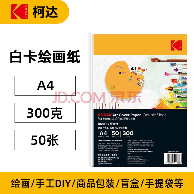 商品相册:KODAK柯达 A4硬白卡纸绘画纸牛皮纸封面纸 厚彩纸儿童手工纸 300克厚硬 50张装9891-215第