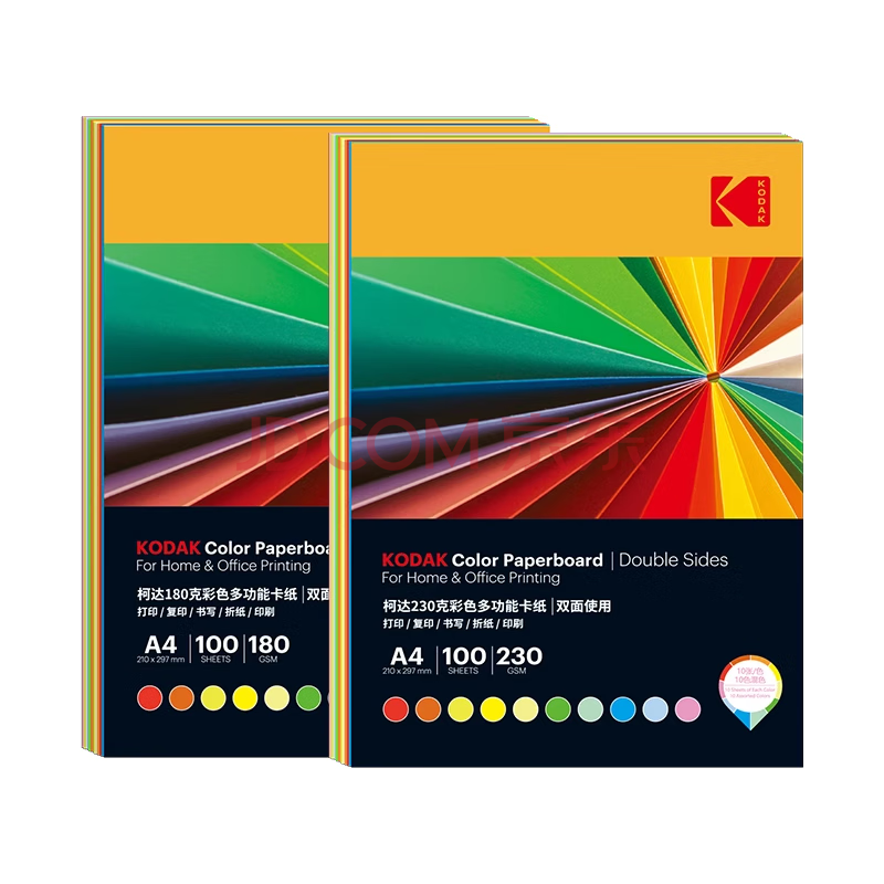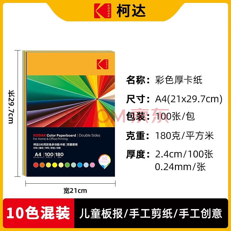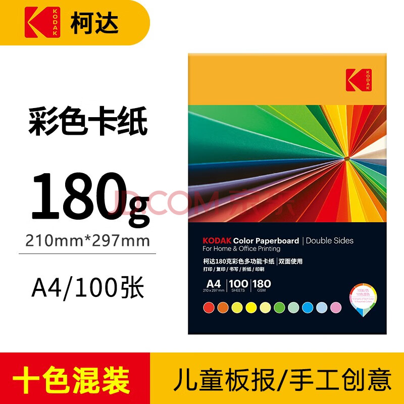 商品相册:KODAK柯达 A4彩色卡纸180克厚硬儿童手工折纸厚彩纸美术纸封面纸 十色混装100张装9891-330第