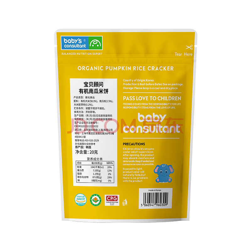 商品相册:宝贝顾问有机米饼原装进口宝宝零食出游儿童零食易溶磨牙棒 南瓜味20g第