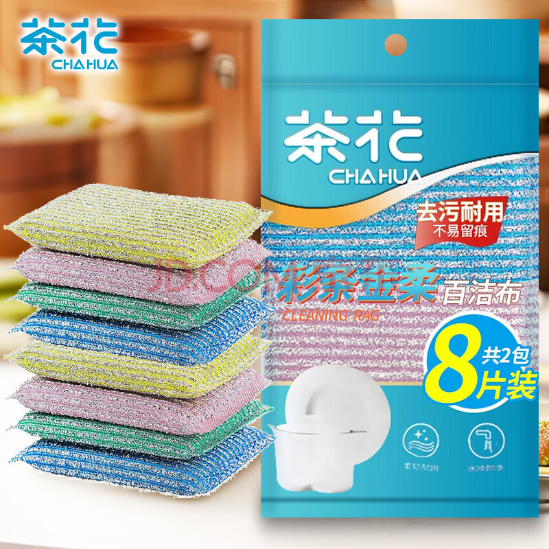 商品相册:茶花 洗碗布 百洁布13*8.5cm8片装彩条金柔厨房去油污抹布*第