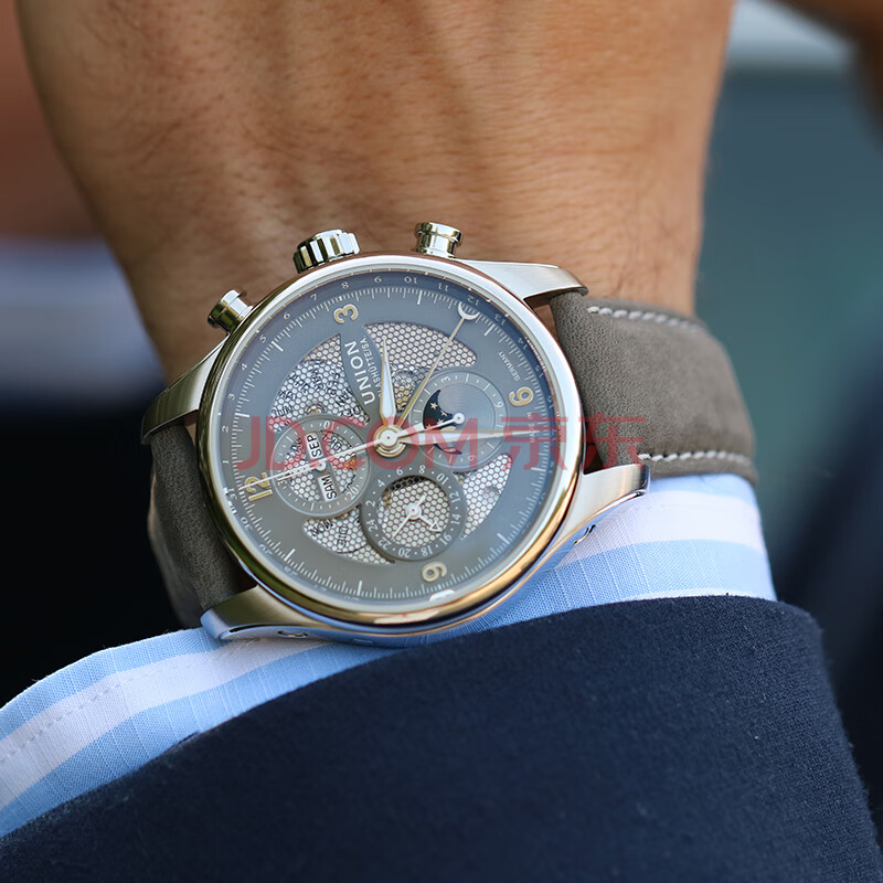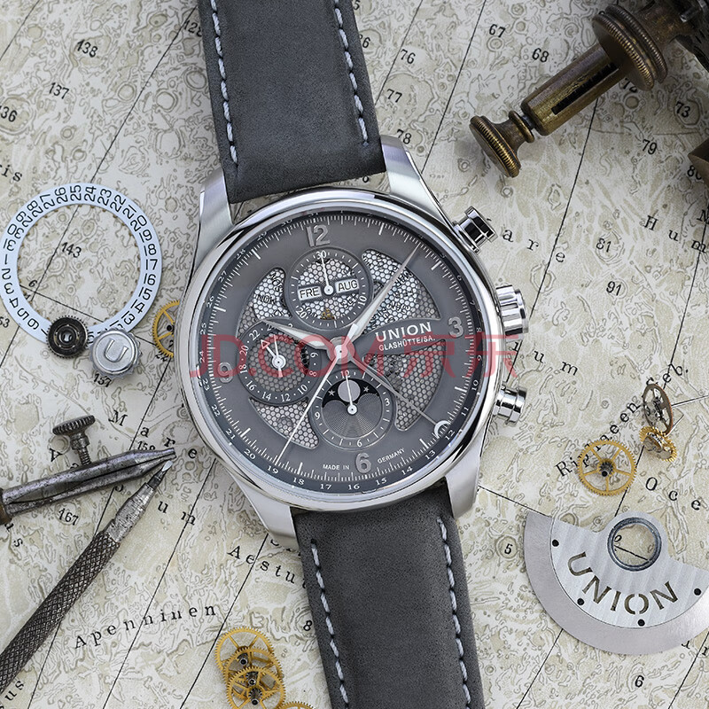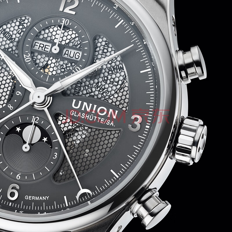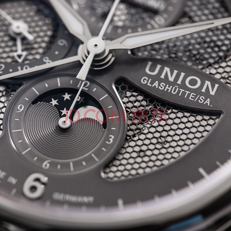 商品相册:宇联(UNION GLASHUTTE SA)格拉苏蒂德国贝利士八针镂空月相机械计时码表D009.425.16.087.00第