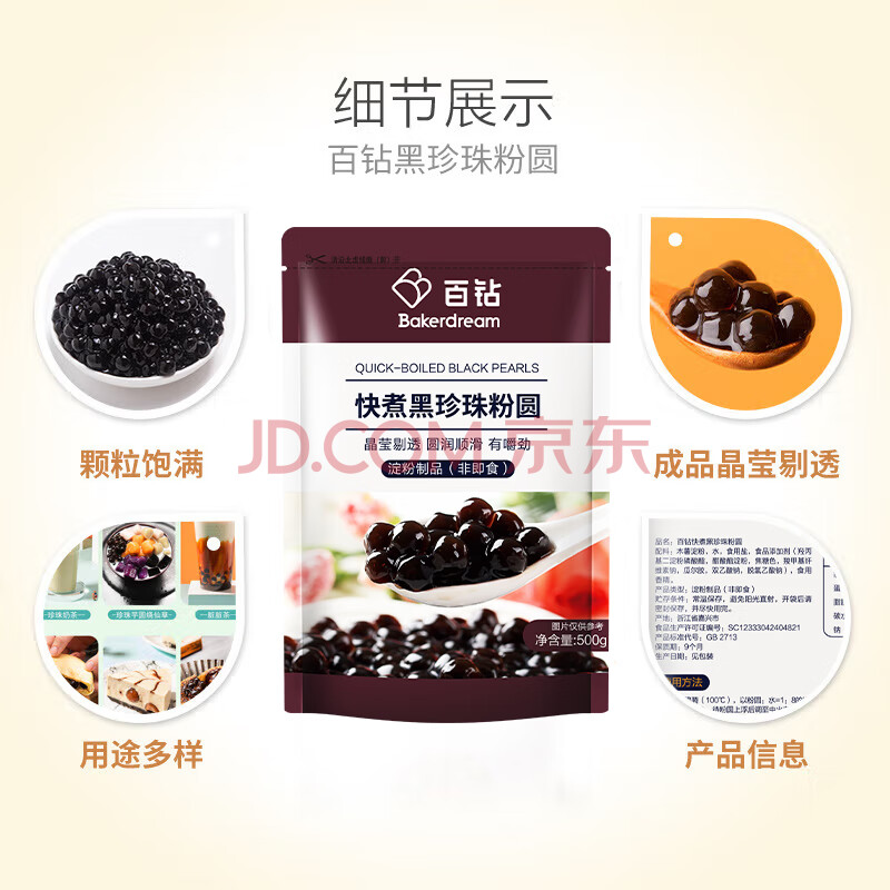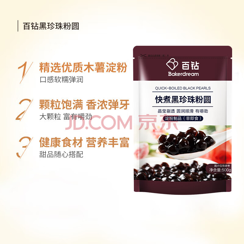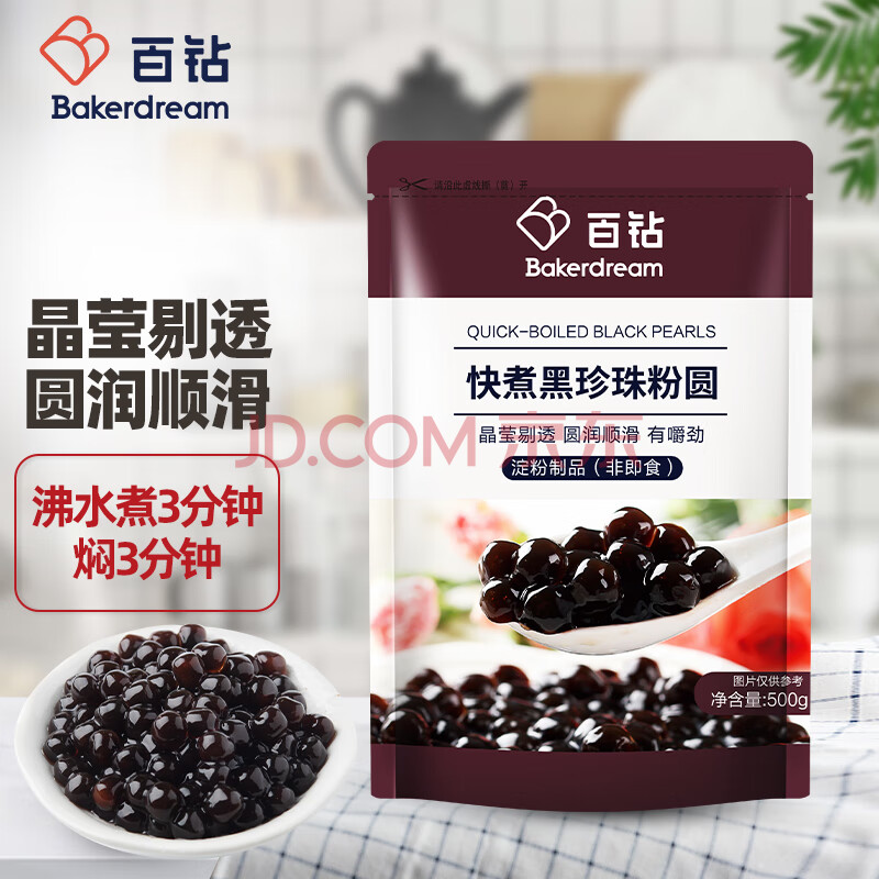 商品相册:百钻快煮黑珍珠粉圆500g家用自制蛋挞芋圆甜品配料珍珠奶茶原料小包装第1张/共9