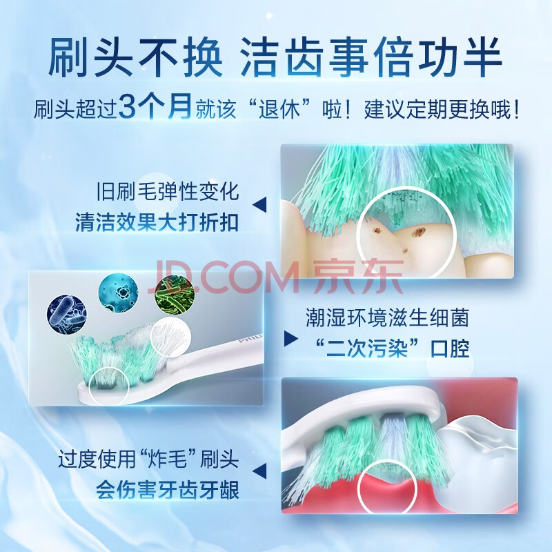 商品相册:飞利浦(PHILIPS)电动牙刷头官方原装适配钻石3/7/9系列刷柄清洁护龈亮白 基础洁净牙刷头 3支装HX6013/63第