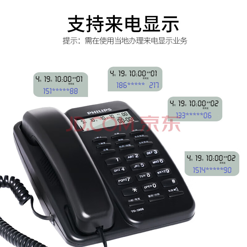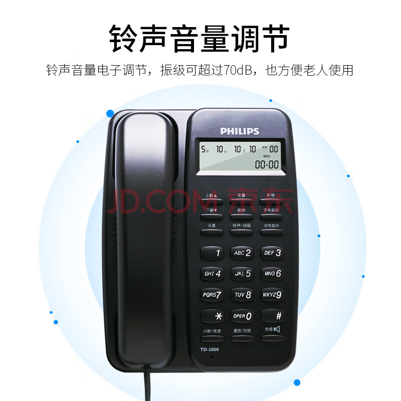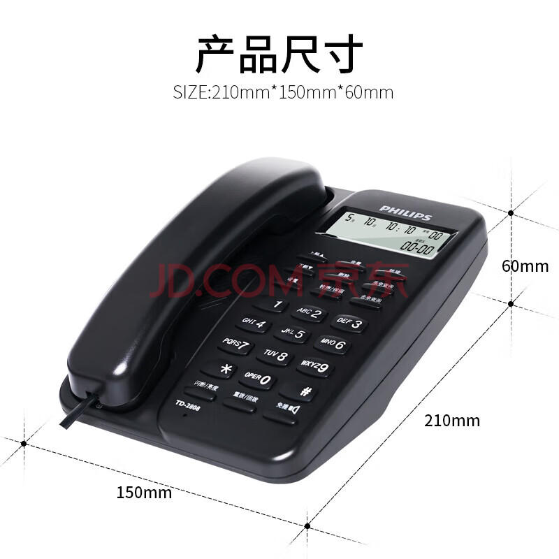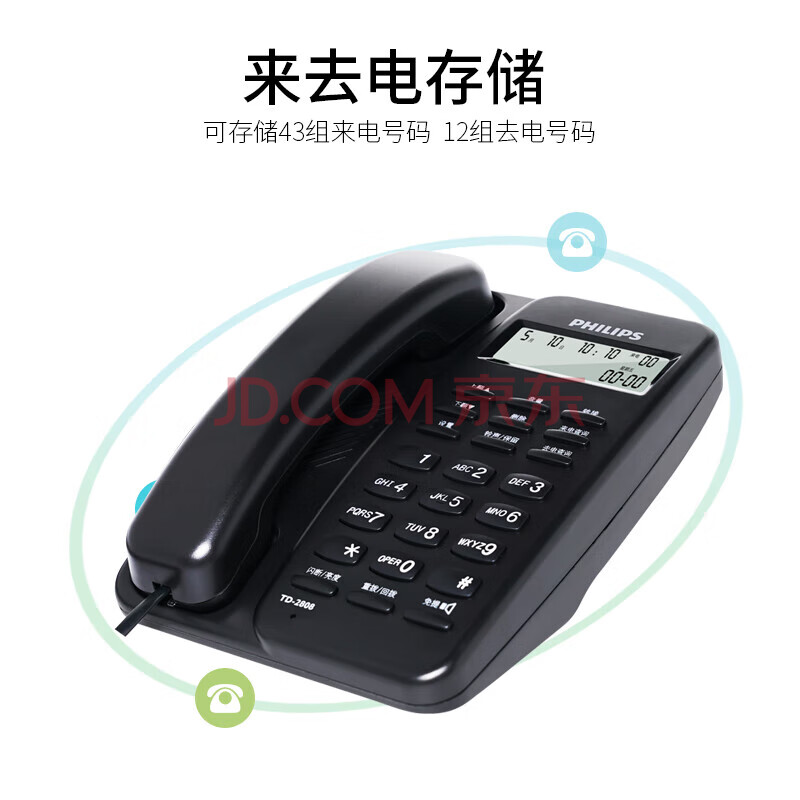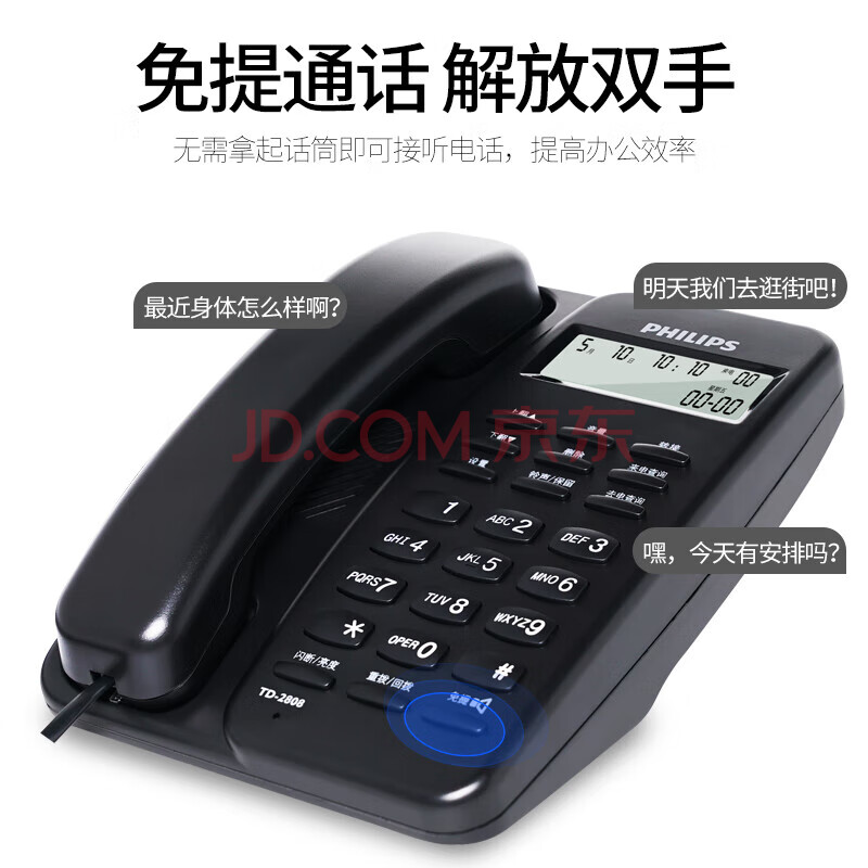 商品相册:飞利浦(PHILIPS)电话机座机 固定电话 办公家用 免提通话 免电池 来电显示 TD-2808 (黑色)第1张/共7