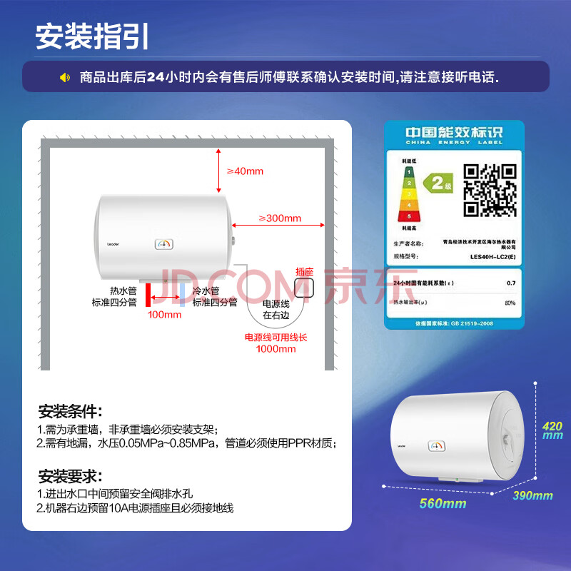商品相册:海尔出品统帅 40升电热水器京东自营上门安装2200W节能速热家用储水式专利防电墙租房优选LC2第