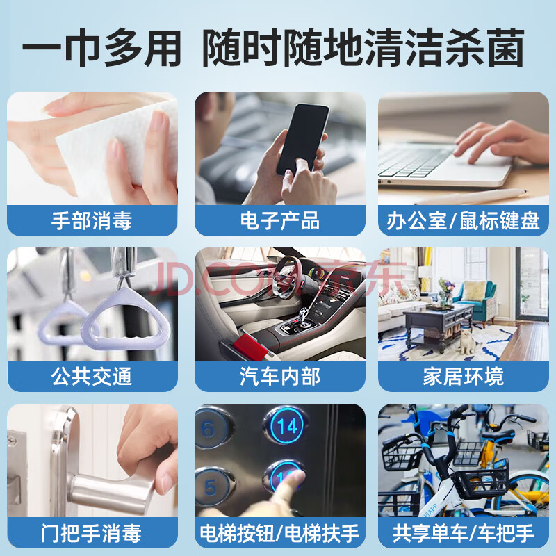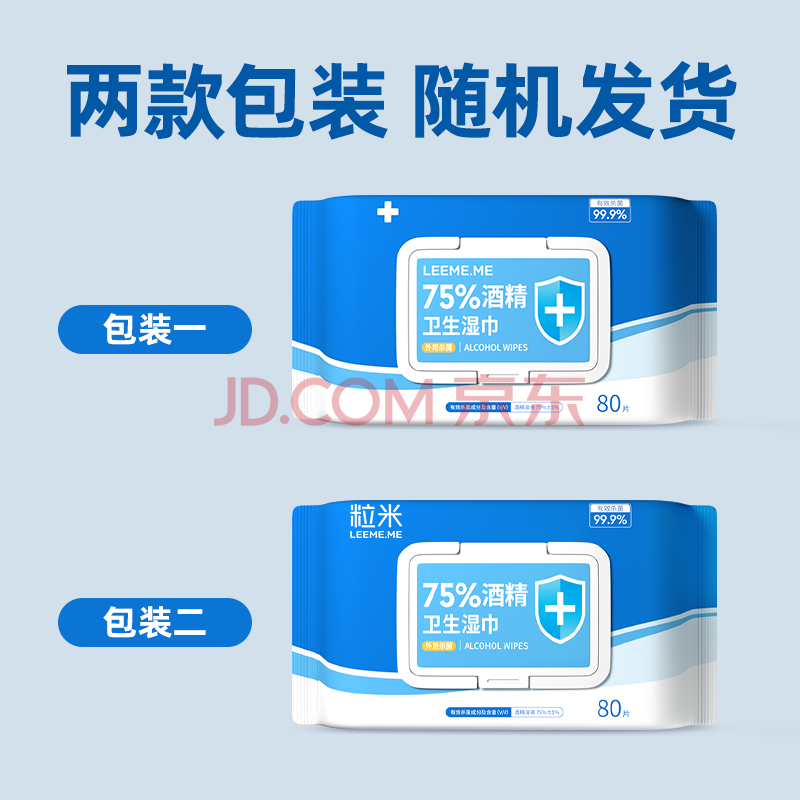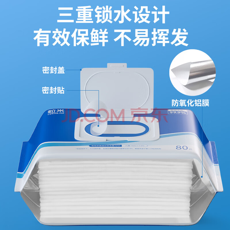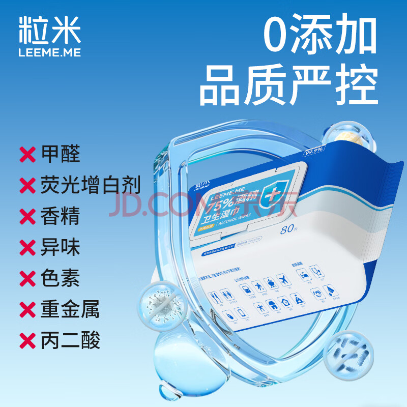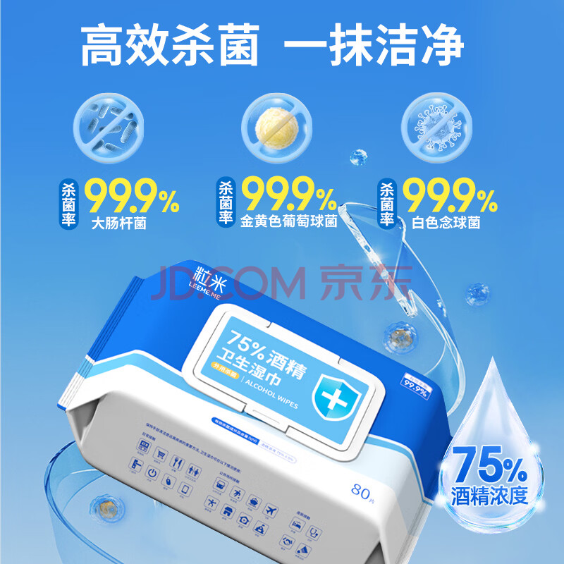 商品相册:粒米75%酒精消毒湿巾80片杀菌卫生湿纸巾儿童上学桌椅餐具消毒棉片第