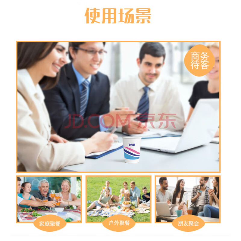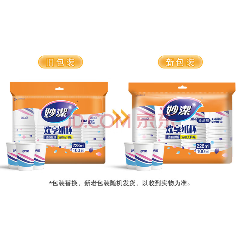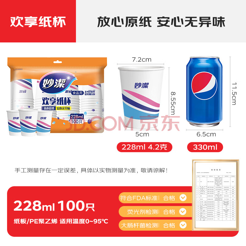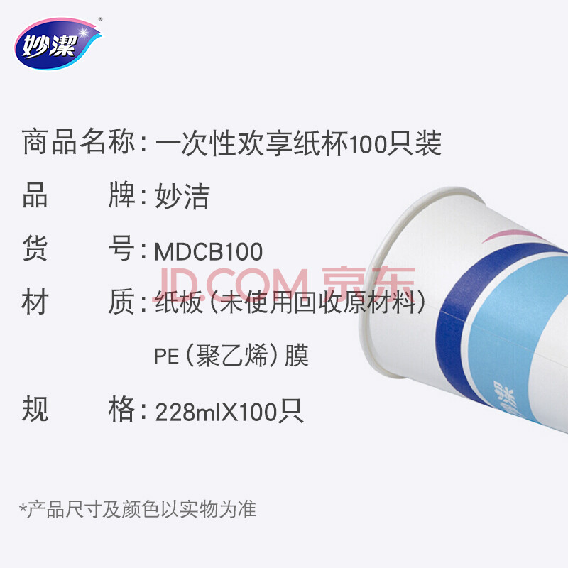 商品相册:妙洁一次性水杯 欢享纸杯228ml*100只加厚食品级家用办公商务茶水杯子第