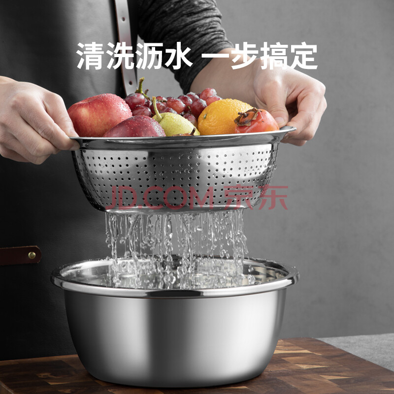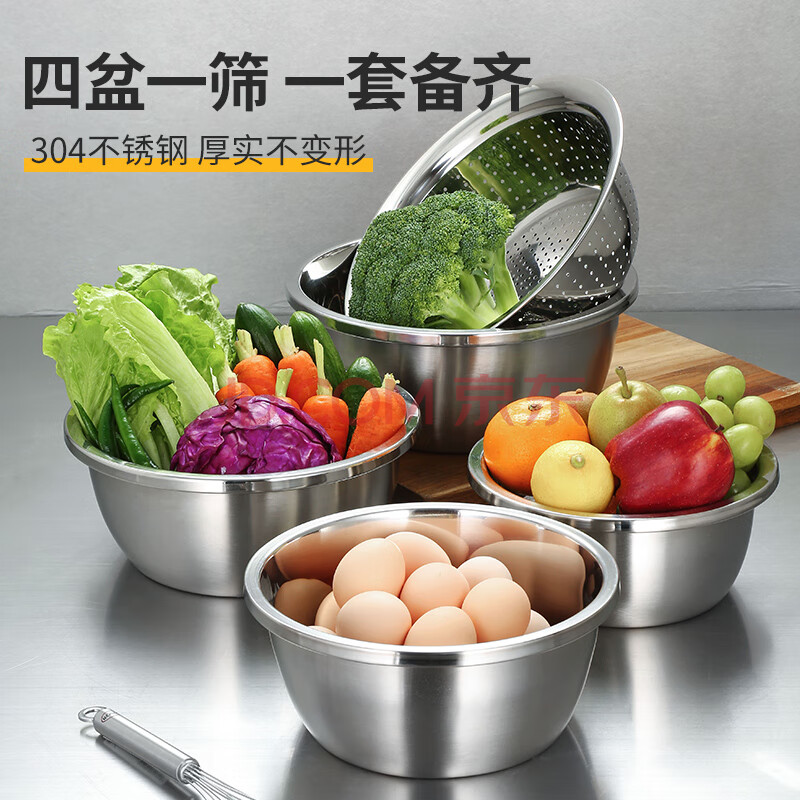 商品相册:炊大皇304不锈钢盆筛五件套 加厚洗菜盆和面盆调料腌肉盆米筛五个组合装第