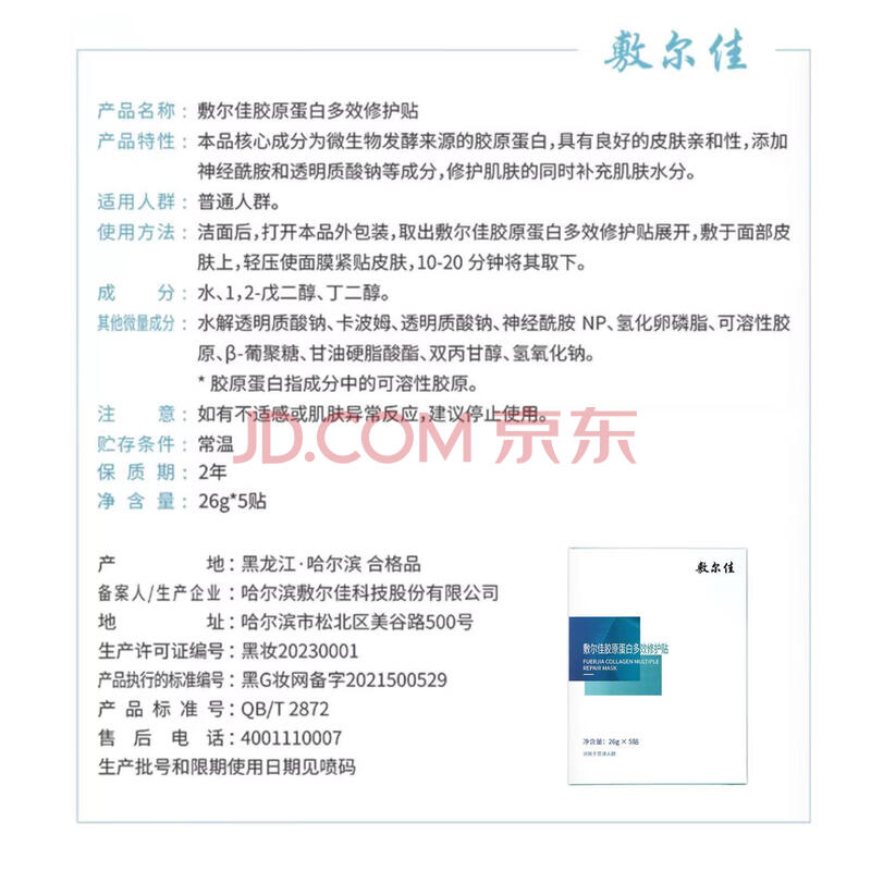 商品相册:敷尔佳【成毅同款】胶原蛋白多效修护贴26g*5片 补水保湿修护肌肤第