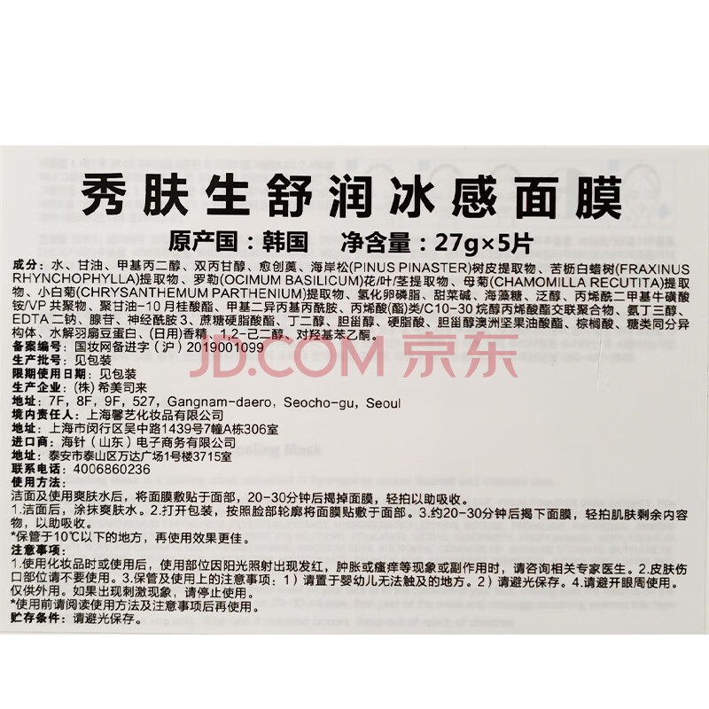 商品相册:秀肤生舒润冰感面膜27g*5补水保湿滋润养肌肤男女士韩国进口女神节礼物第