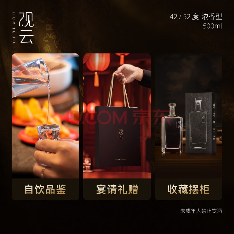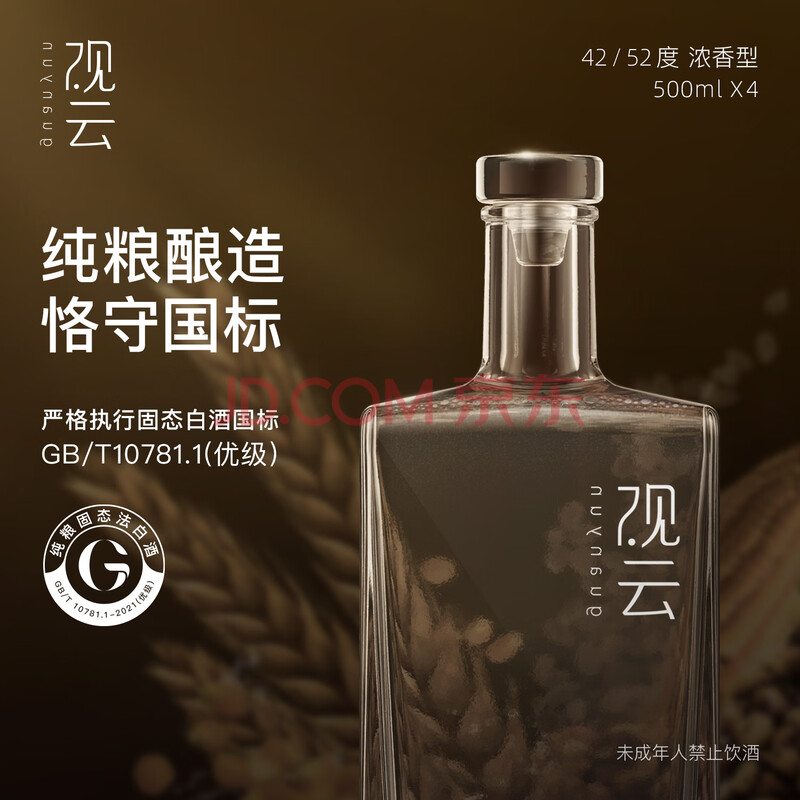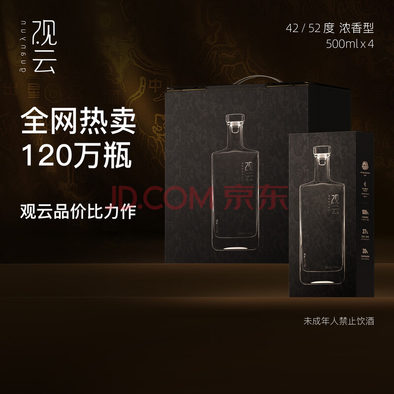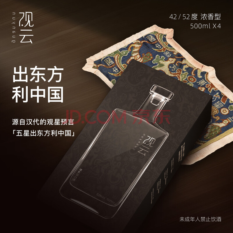 商品相册:观云出东方 浓香型白酒 52度 500ml*4瓶 整箱装 含礼袋*2 节日送礼第